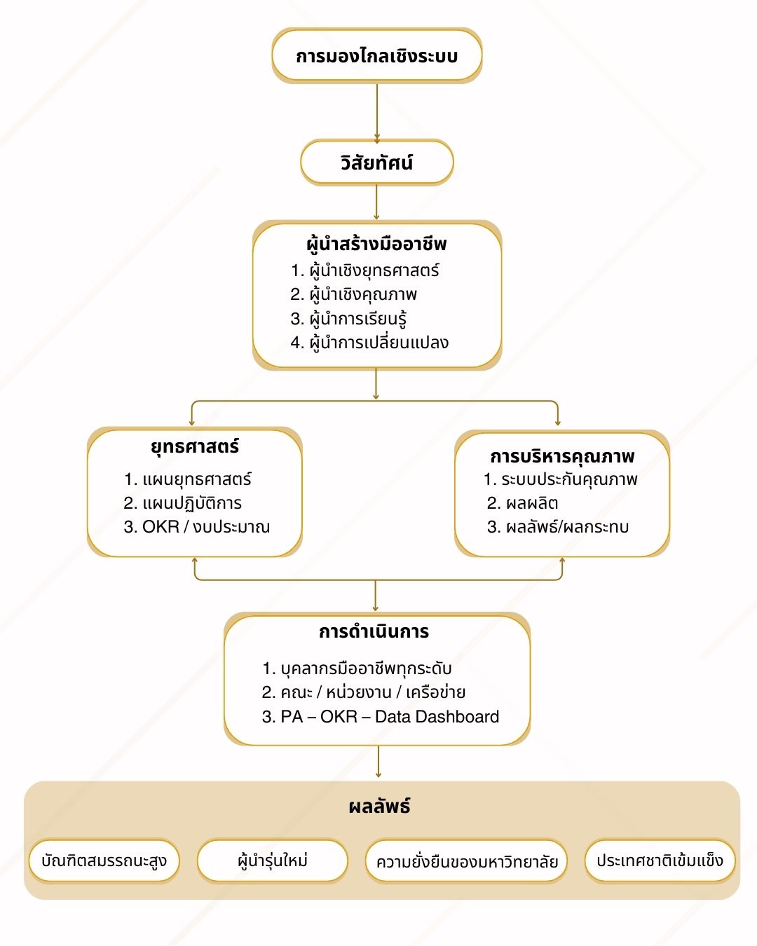 การมองไกลต้องเชื่อมยุทธศาสตร์มหาวิทยาลัยเข้ากับ Mega Trends เช่น สังคมสูงวัย เศรษฐกิจสร้างสรรค์ ดิจิทัลทรานส์ฟอร์เมชัน และการพัฒนาที่ยั่งยืน เพื่อให้มหาวิทยาลัยเป็น “กลไกหลัก” ของการยกระดับเพื่อพัฒนาประเทศชาติอย่างแท้จริง
